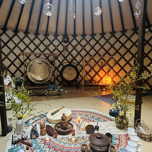 В юрте звучат поющие чаши, гонги, ханг и хрустальная арфа.