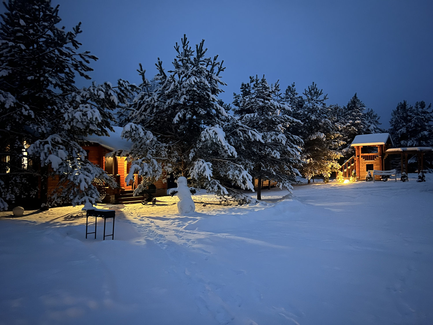 Одноэтажные деревянные дома на берегу озера Селигер с пляжем и пирсами