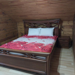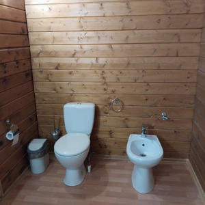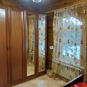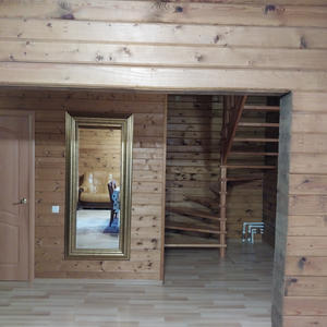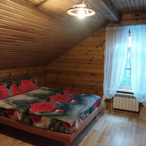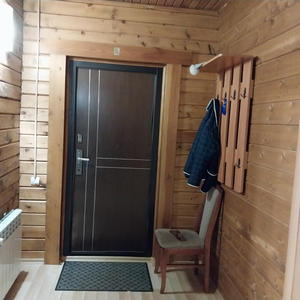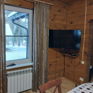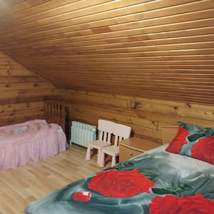 Коттедж-дуплекс площадью 85 кв.м на двух этажах. Вторая половина дома идентична, дом можно снять полностью. В доме две спальни с двуспальными кроватями. Стены из бревна. Есть панорамные окна с видом на лес. Расположен в 100 метрах от воды на участке в 100 соток в сосновом лесу. На территории также есть два гостевых дома.