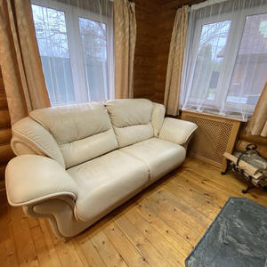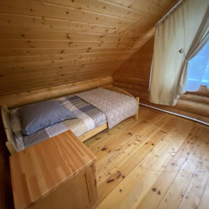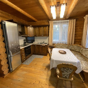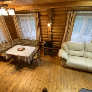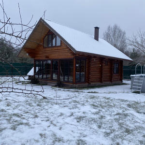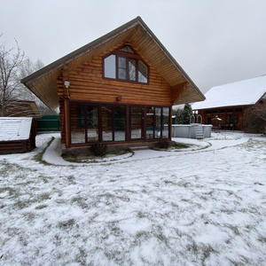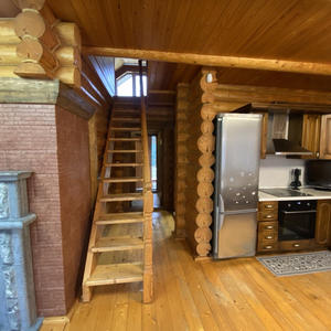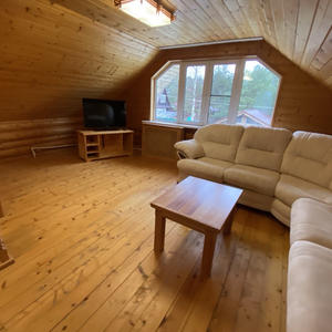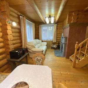 Двухэтажный деревянный дом из бревен с мансардой и панорамными окнами. На территории находятся два деревянных дома. Участок закрытый. Дом вмещает до 6 человек в трех комнатах. В доме есть камин, сауна и бильярд.