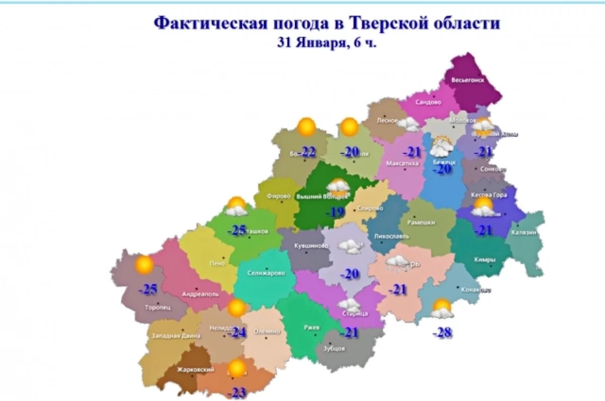 В Осташкове и Пено утром 31 января столбики термометров показали −25 градусов. Такие же значения зафиксировали синоптики в Торопце.По всей Тверской области до 3 февраля действует «оранжевый уровень» погодной опасности из-за сильных морозов. Об этом сообщил Гидрометцентр России.Самый сильный холод утром 31 января пришёлся на Конаково — там температура опустилась до −28 градусов. Эти цифры приводят тверские синоптики по официальным данным на 6 утра.