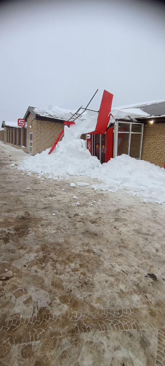 Сход снега с крыши магазина «Магнит» на Загородной улице в Осташкове: логотип повреждён, вход завален