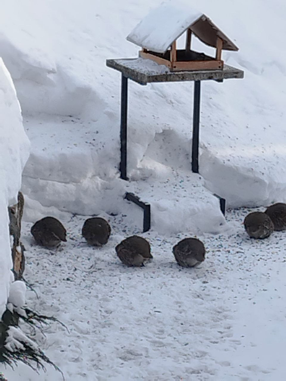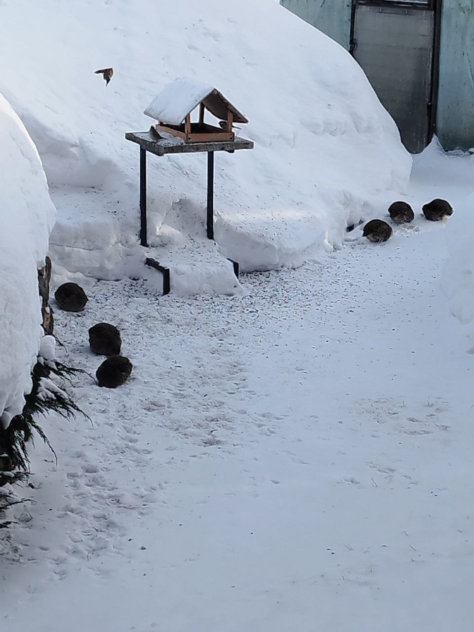 Воробьи, синицы, снегири, а сегодня ещё и куропатки. В день по 1,5 литра семечек съ едают.