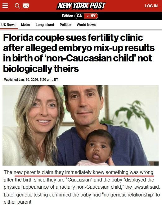 Наберите воздуха в грудь: семья из Флориды подала в суд на клинику ЭКО после того, как у них родился темнокожий ребёнок.