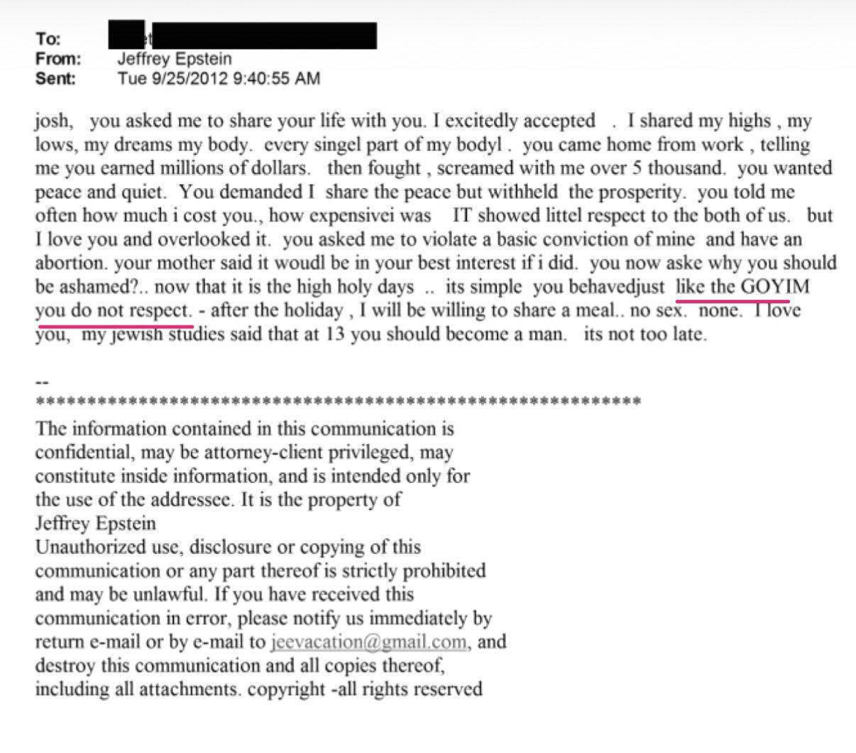 Электронные письма влиятельного педофила Джеффри Эпштейна содержат многочисленные оскорбления в адрес "гоев" (неевреев) и утверждений о превосходстве евреев над другими народами.