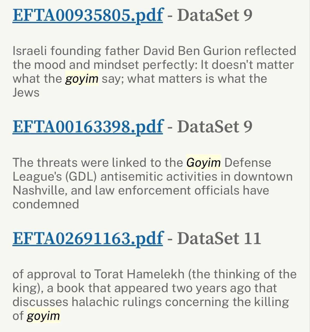 Также в документах фигурирует издание «Шимон Пост», в котором цитируются слова бывшего главного раввина сефардов Овадьи Йосефа — «Гои были рождены только для того, чтобы служить нам (евреям)», а также заявление экс-премьер-министра Израиля Давида Бен-Гуриона «Не имеет значения, что говорят "гои" — важно то, что делают евреи».