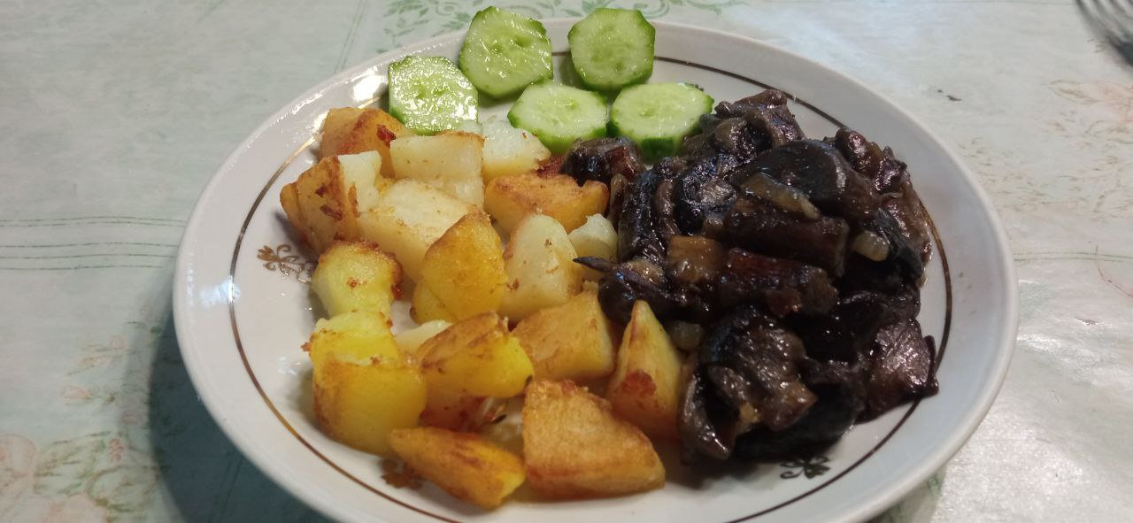 Приятного аппетита!!! У меня сейчас тоже самое кроме грибов, но могу достать варено-мороженные строч...