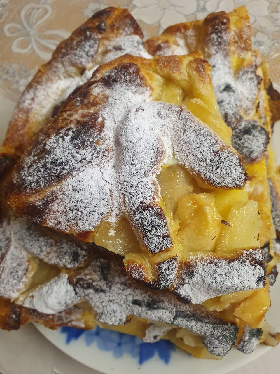 Готовое слоеное тесто. Яблоки два и груши две. Почистить, порезать, посластить. Закидать в тесто. Украсить по желанию. Смазать яйцом и запечь. Сначала снизу, потом функция гриль и ваш пирожок румянец получает. Ну и припудрить от души!
