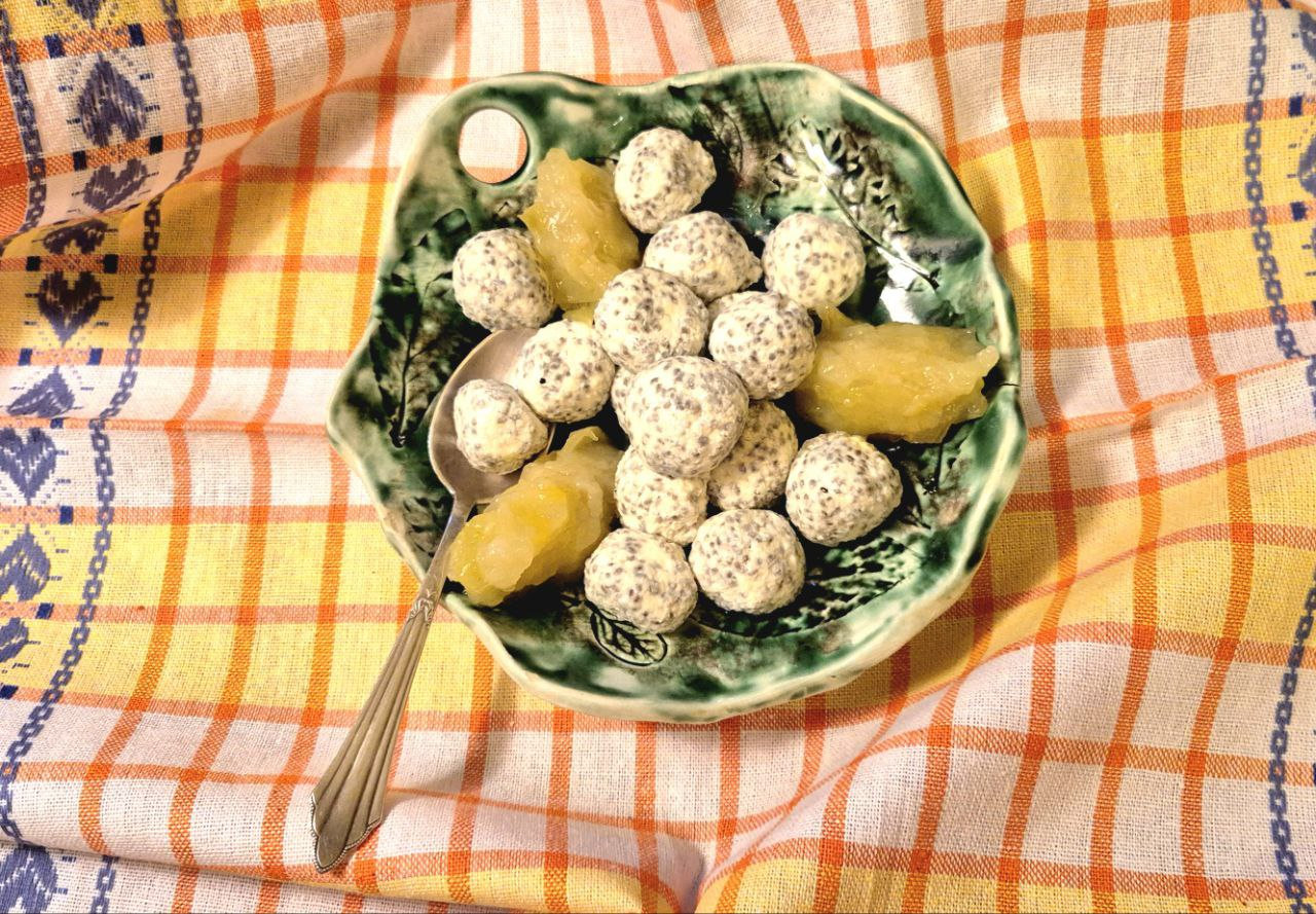 2 пачки творога, 1 яйцо, 4 ст.л. семян чиа, щепотка соли. Кому неймется, можно подсластить, чем кошерно. Дать постоять с полчасика, накатать шариков, отварить в подсоленной воде после всплытия 1 минуту. Нежно, вкусно, и очень сытно, потому что чиа дают это прекрасное чувство надолго. Употреблять, с чем и обычные вареники - сметана, греческий йогурт, варенье, ягодки какие. У меня тут печеная антоновка. Ну и маслица, какого не жалко. У меня тут "Альтеро" с оливковым, чтобы не слиплись. Поскольку получаетмя много, на двоих на пару завтраков точно. При разогревании никакой потери вкуса.