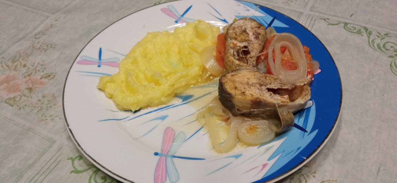 А, у нас по деревенски...форель радужная на луково-помидорной подушке с пюрешкой 👌