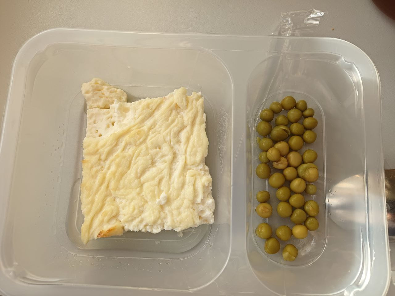 Это ужин (Квадратный омлет и чайная ложка консервированного горошка).