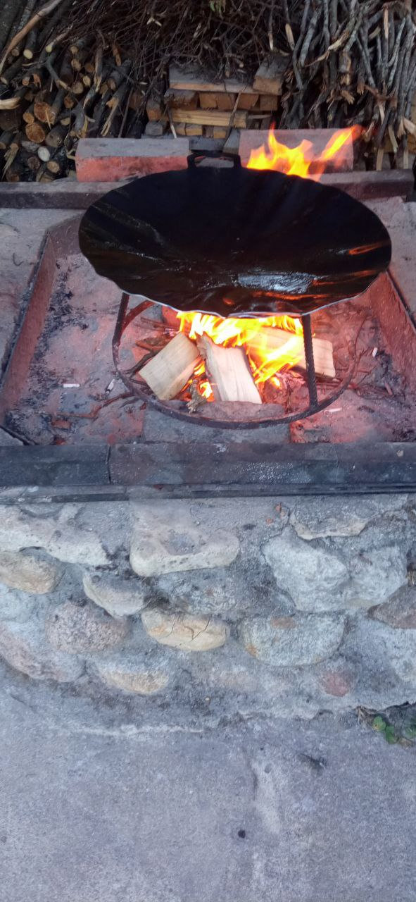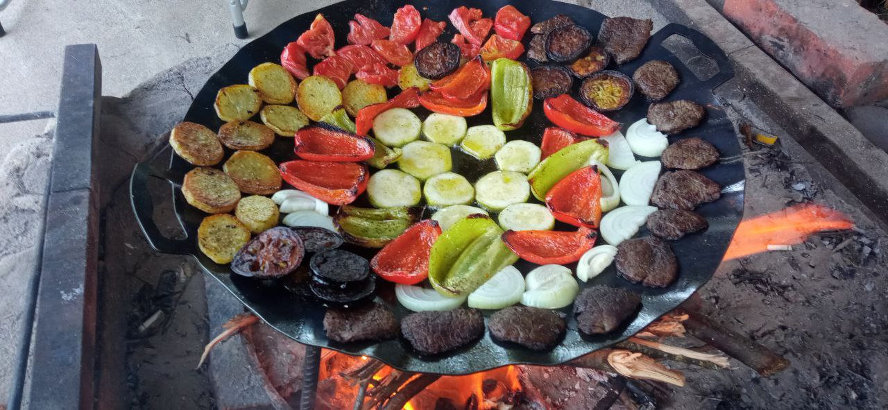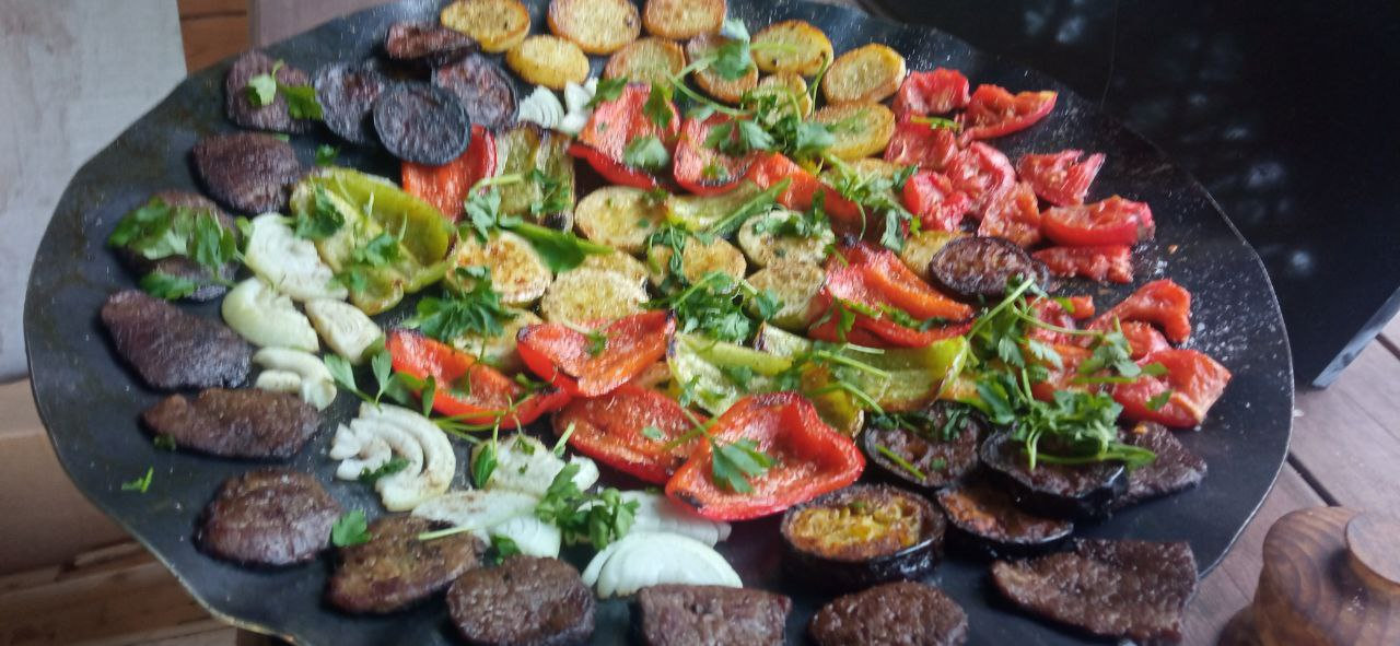 Садж работает от центра к краям. Сначала обжариваем, то что в центре. Затем обжаренное перемещаем к краю, чтобы томилось. В центр помещаем новые ингредиенты.