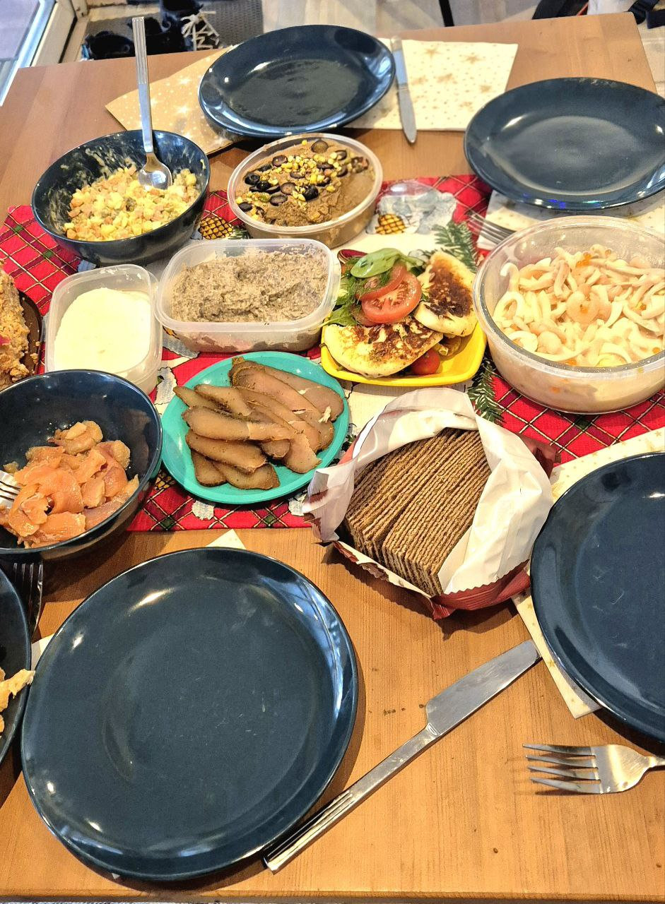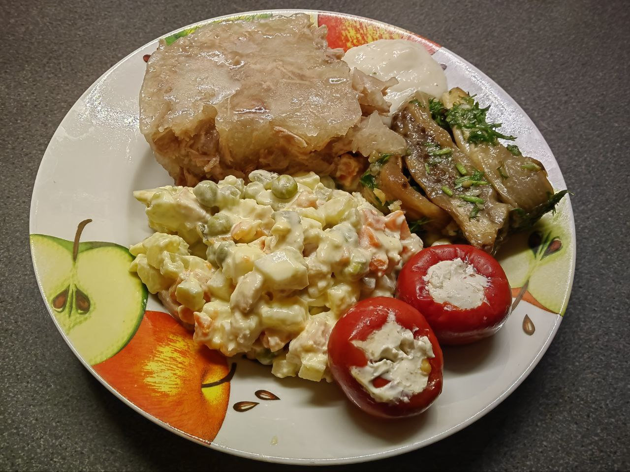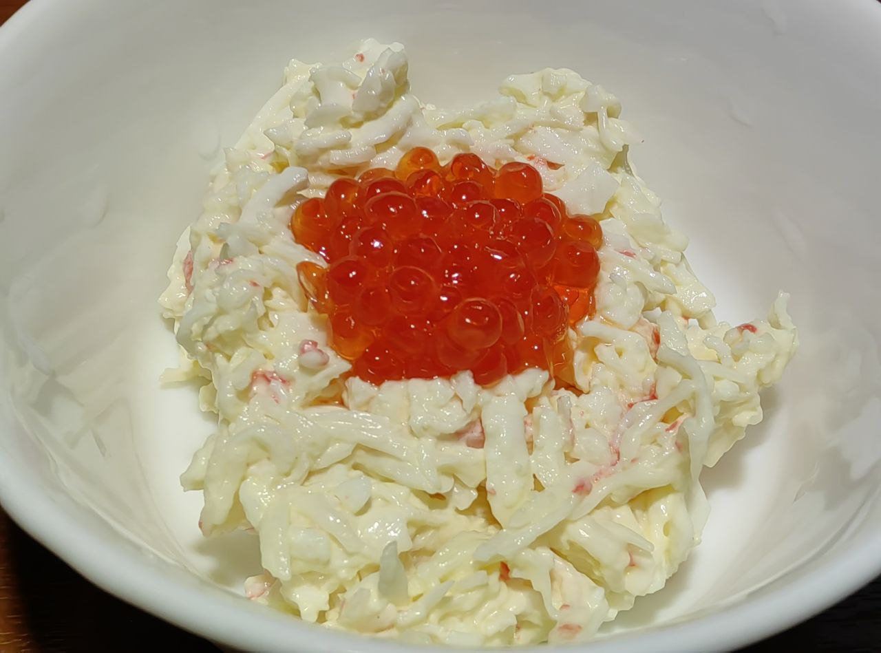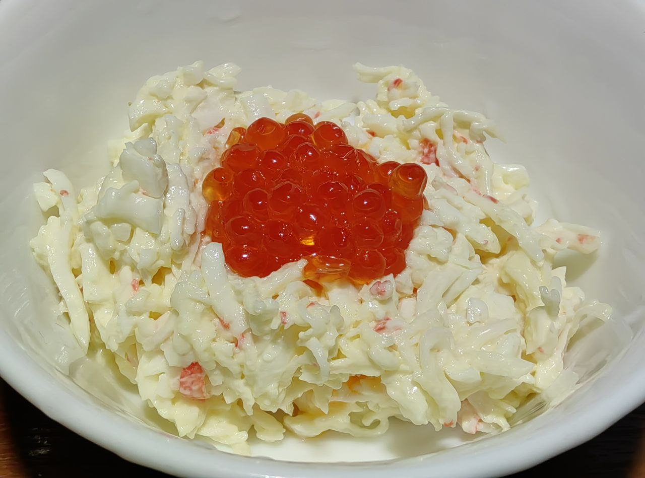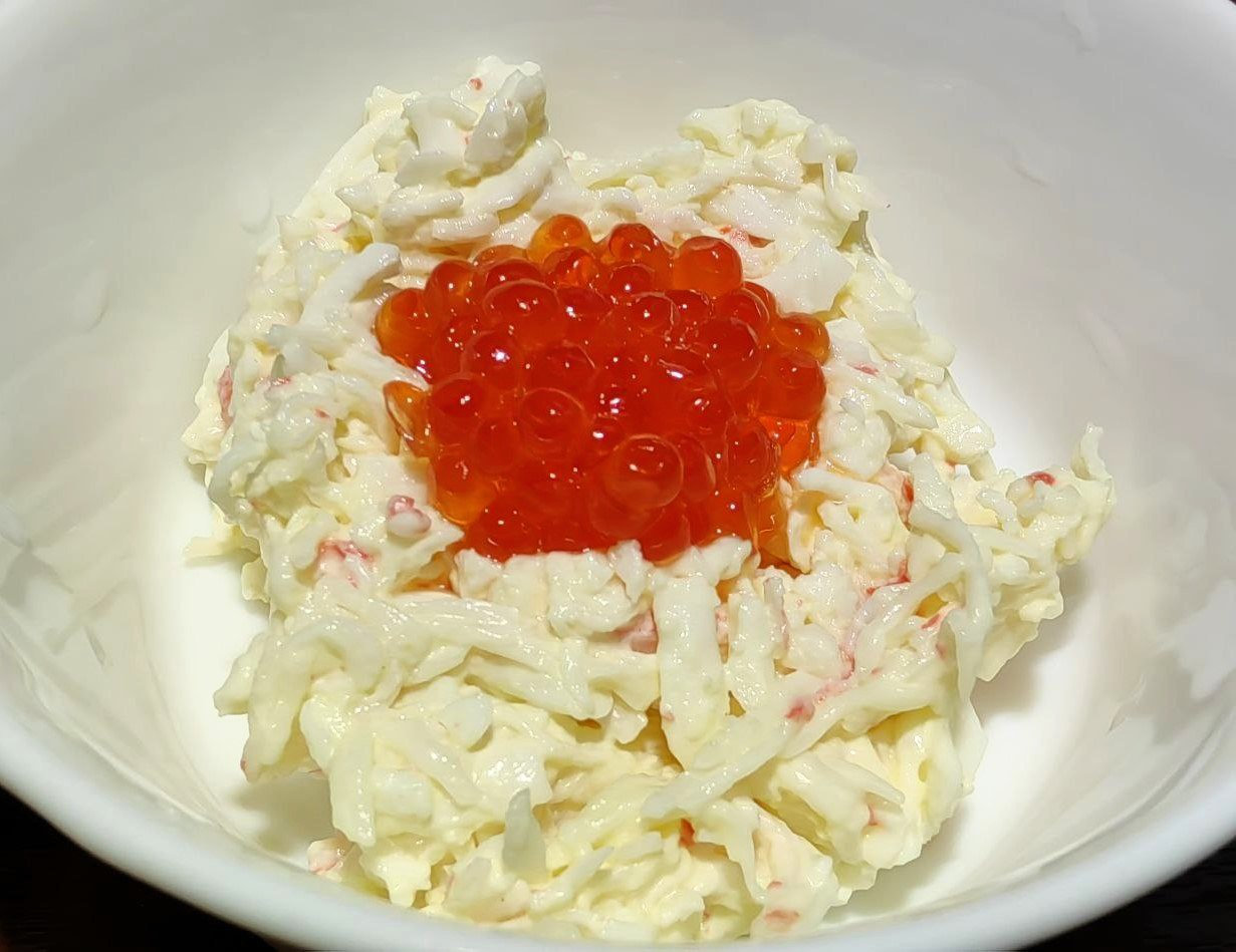 Яйца (целиком), кальмары, креветки, красная икра, домашний майонез. Фото нет, съели. Попроще, но при...