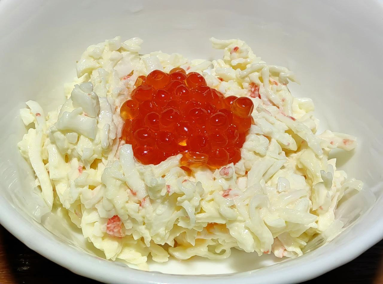 Яйца (целиком), кальмары, креветки, красная икра, домашний майонез. Фото нет, съели. Попроще, но примерно то же самое.