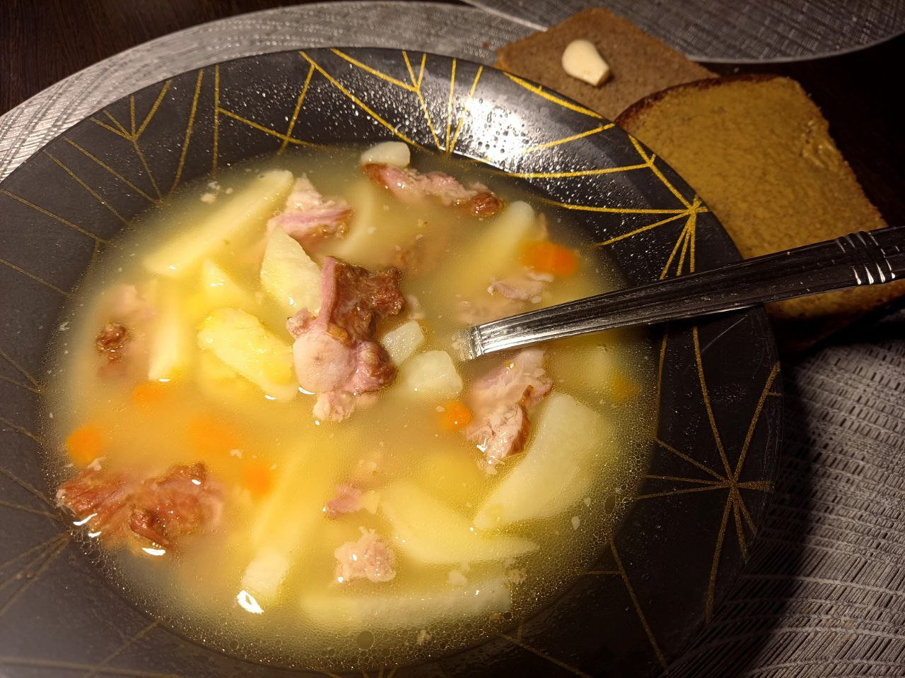 Суп гороховый, антивирусный. С "заводской" горчицей, чесноком и хлебом ). Отличный! Заходит на ура!