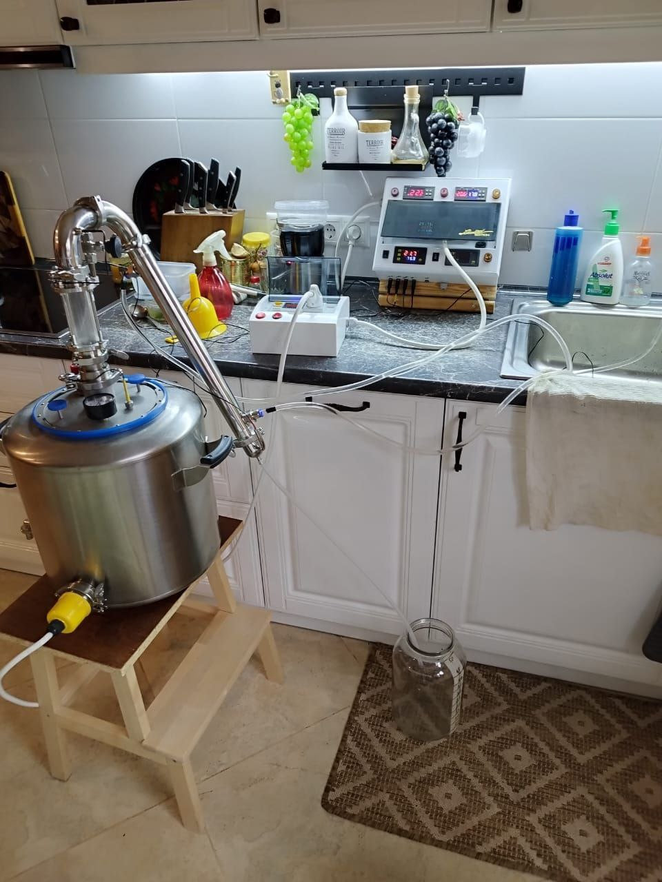 После того, как брага поспела, делаем первый перегон (потстил). Делать приходится за два раза. В итоге получаем 25 л разбавленного до 25-28℅ спирта сырца, который очищается кокосовые углем.
