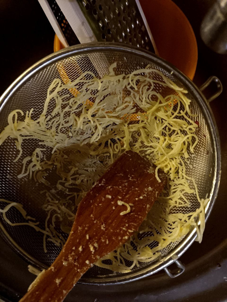 Сварил до полуготовности спагетти, откинул их в дуршлаг, даже не смазав маслом.