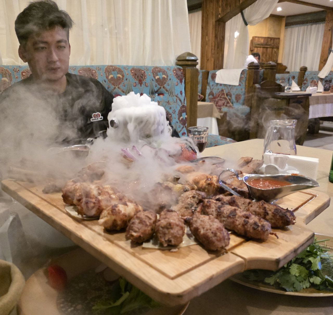 В Москве Уиткоффу устроили роскошный показ русской кухни: на стол подали салаты «Столичный», крабовый и «Мимозу», пельмени с грибами, посикунчики с крабом, перепёлку с гречкой, филе оленя, палтуса на пару, свеклу с горгонзолой, крабов, морской гребешок, мясные закуски и три вида икры — чёрную, красную и щучью; на десерт — медовик, «Наполеон» и яблочный шарм.