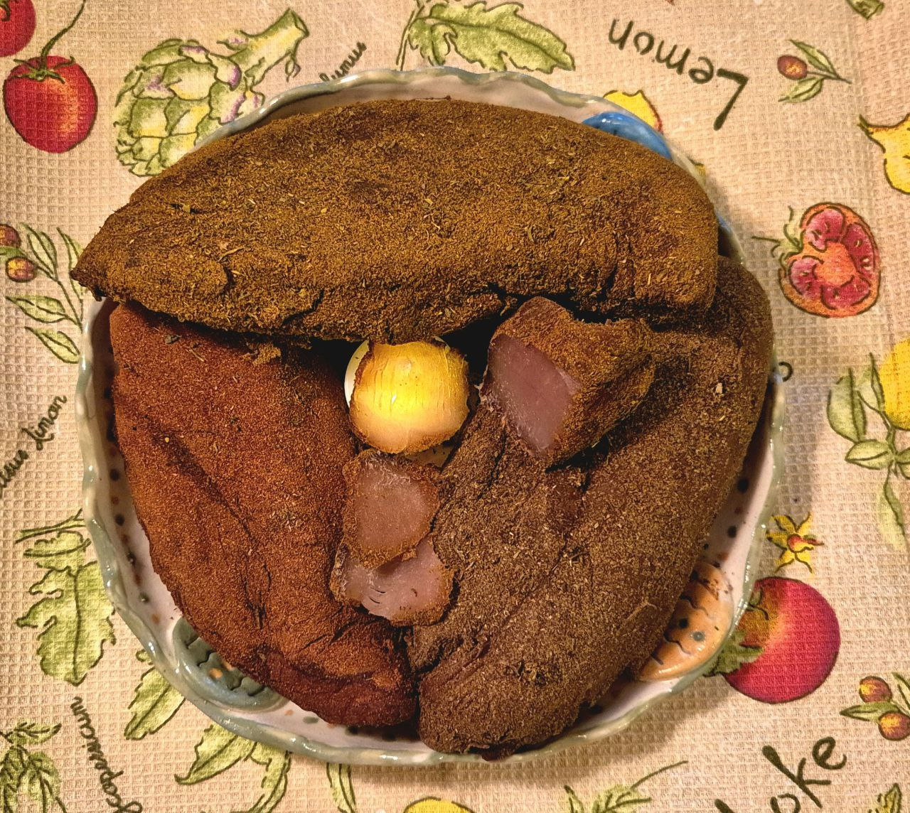 Бастурма... или что-то вроде того из куриной и индющачьей грудок. В хмели-сунели и копченой паприки. Проба контрольного кусочка 👌. Вон он светится в серединке.