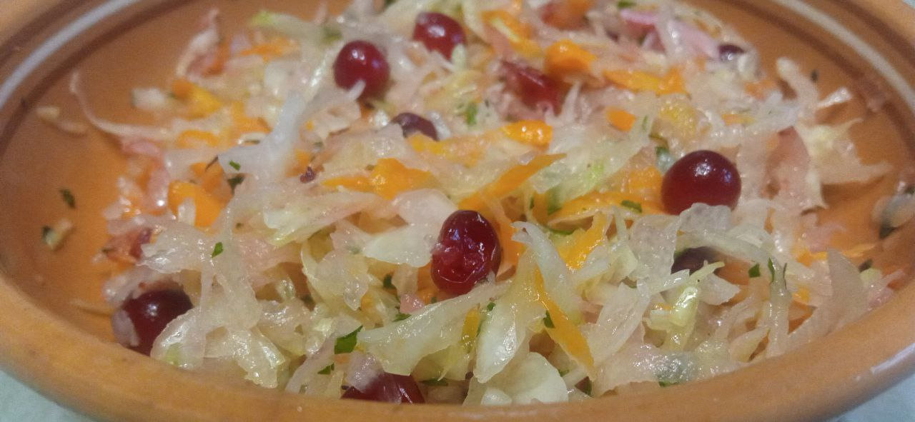 Как и обещал...салат "Лекарь". Редька зелёная, морковь, капуста квашеная, клюква и заправка постным маслицем 👍
