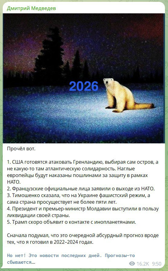 💥США с 1 февраля повысят пошлины против Дании, Норвегии, Швеции, Франции, Германии, Великобритании, Нидерландов и Финляндии до 10%, с 1 июня — до 25%, заявил Дональд Трамп. Пошлины будут взиматься до тех пор, пока не будет достигнута договоренность об окончательной и полной покупке Гренландии.