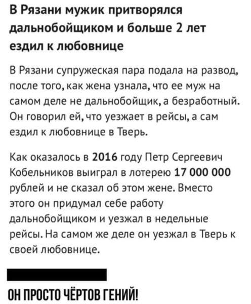Ещё жена отсудит компенсацию 50% выигрыша при разводе 😂🤷♂.