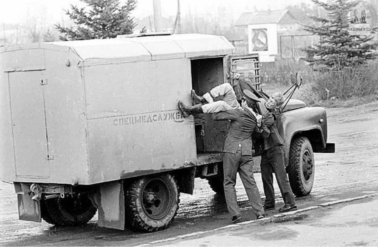 В 1970-е годы милиционеры загружают нетрезвого человека в спец машину медвытрезвителя, чтобы доставить его для вытрезвления.
