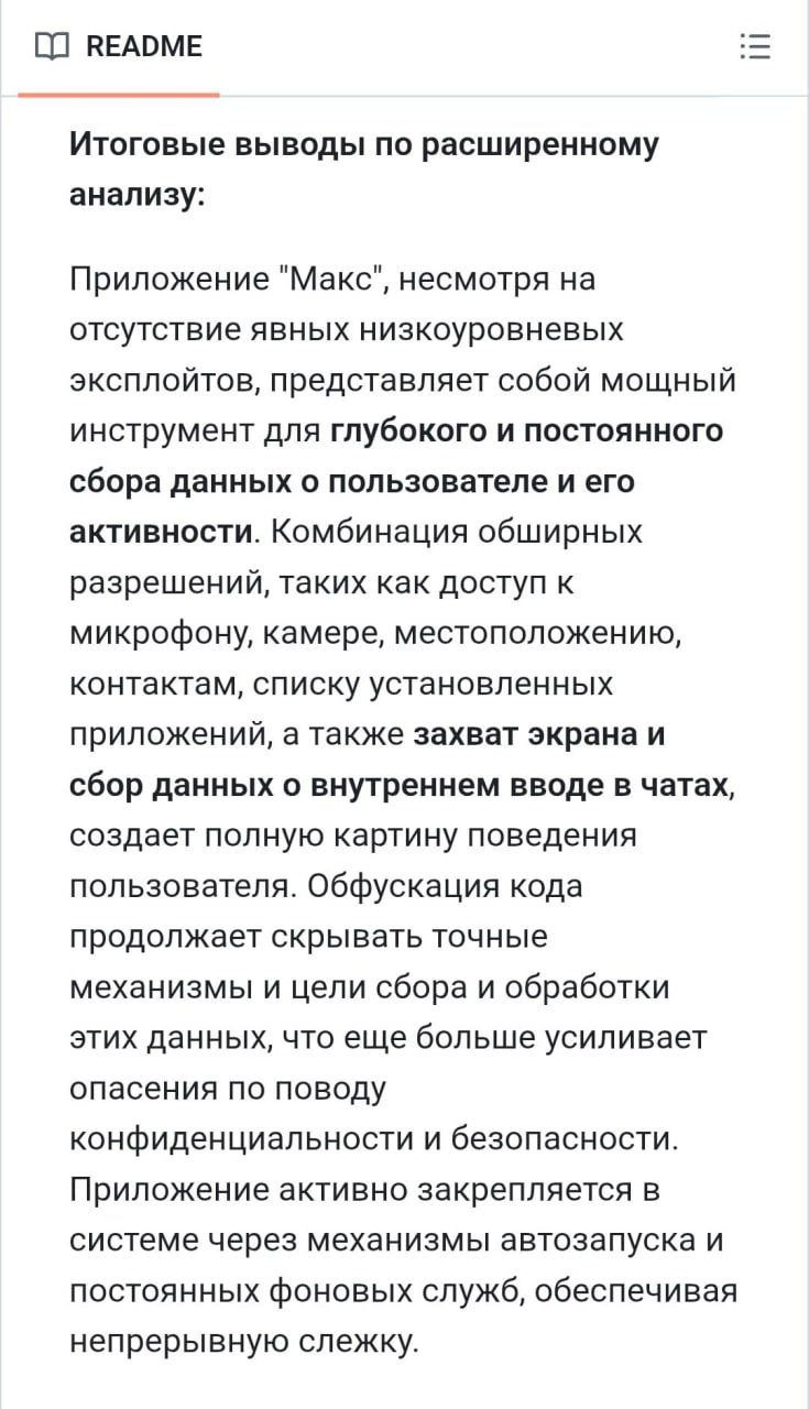 Мессенджер Max собирает и отсылает куда-то всю личную информацию пользователя. Эксперты с GitHub разобрали файл приложения и выяснили, что он шпионит на всех уровнях: пишет звук и экран, сливает владельцам данные о телефоне, системе, геопозицию и личную информацию. Программа следит за всеми приложениями и фиксирует даже неотправленный текст. При этом значительная часть кода зашифрована, и масштабы слежки до конца непонятны.