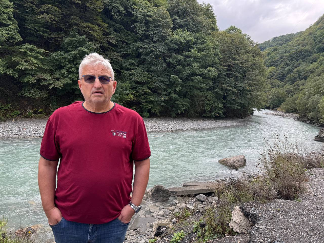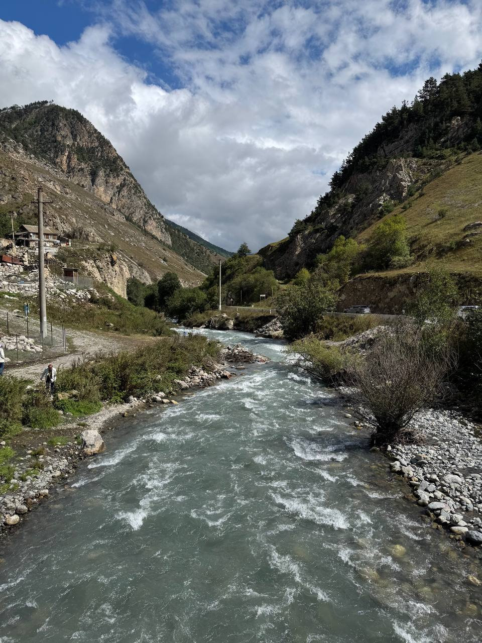 Место, где прошел сель с гор. Шел гигантский поток высотой 250 метров, это не ошибка, заполнил все ущелье доверху, со скоростью до 200 км/час. Погибло 125 человек, в том числе съемочная группа С. Бодрова. Нашли только 17 человек.